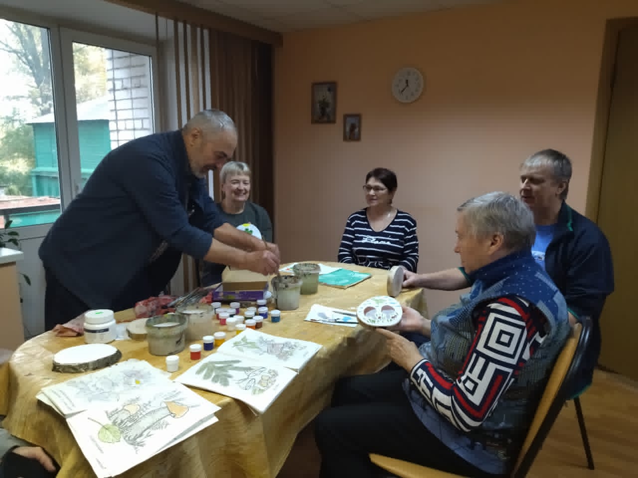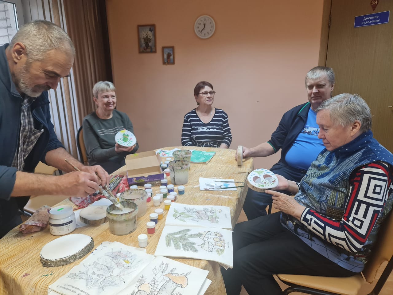 Сегодня в нашем Центре прошел мастер класс по художественной обработке дерева (роспись спила дерева) и лекция МВД на тему безопасности для пенсионеров