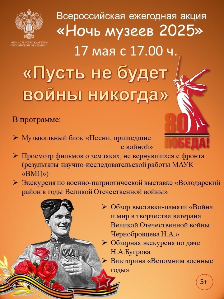 В ночь с 17 на 18 мая в рамках Международного дня музеев в Володарском муниципальном округе пройдет акция "Ночь музеев". В этот день музеи, галереи, выставочные и концертные залы по всей России откроют двери для посетителей в вечернее и ночное время, предлагая тематические экскурсии, выставки, лекции, мастер-классы, концерты и другие культурные мероприятия. Общая тема акции — «Герои». В Год защитника Отечества программа посвящена сохранению исторической памяти и духовно-нравственных ценностей, формированию чувства гордости за страну и её достижения.